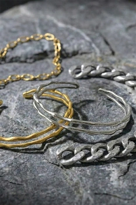 N’hésitez pas à mixer un jonc rigide avec deux ou trois chaînes fines. Le contraste entre le rigide et le souple crée un mouvement harmonieux.