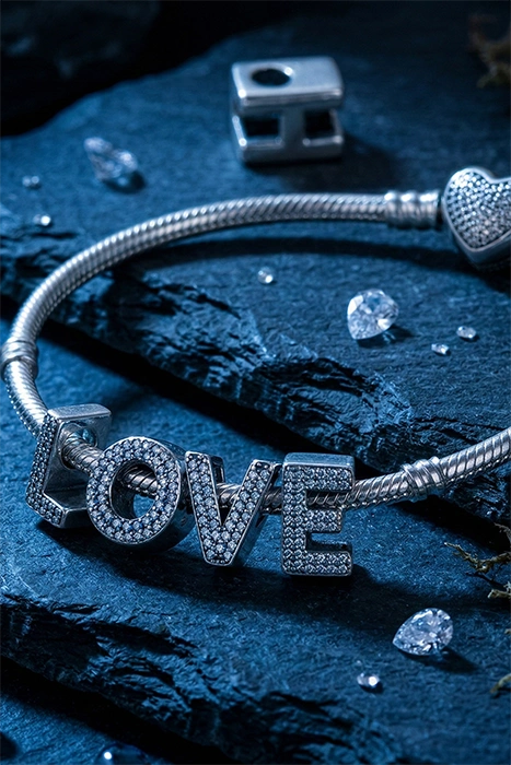 2. Jouez avec les textures Mélangez des charms lisses en argent rhodié avec des pièces texturées (martelées) ou serties de zirconiums pour créer du relief.